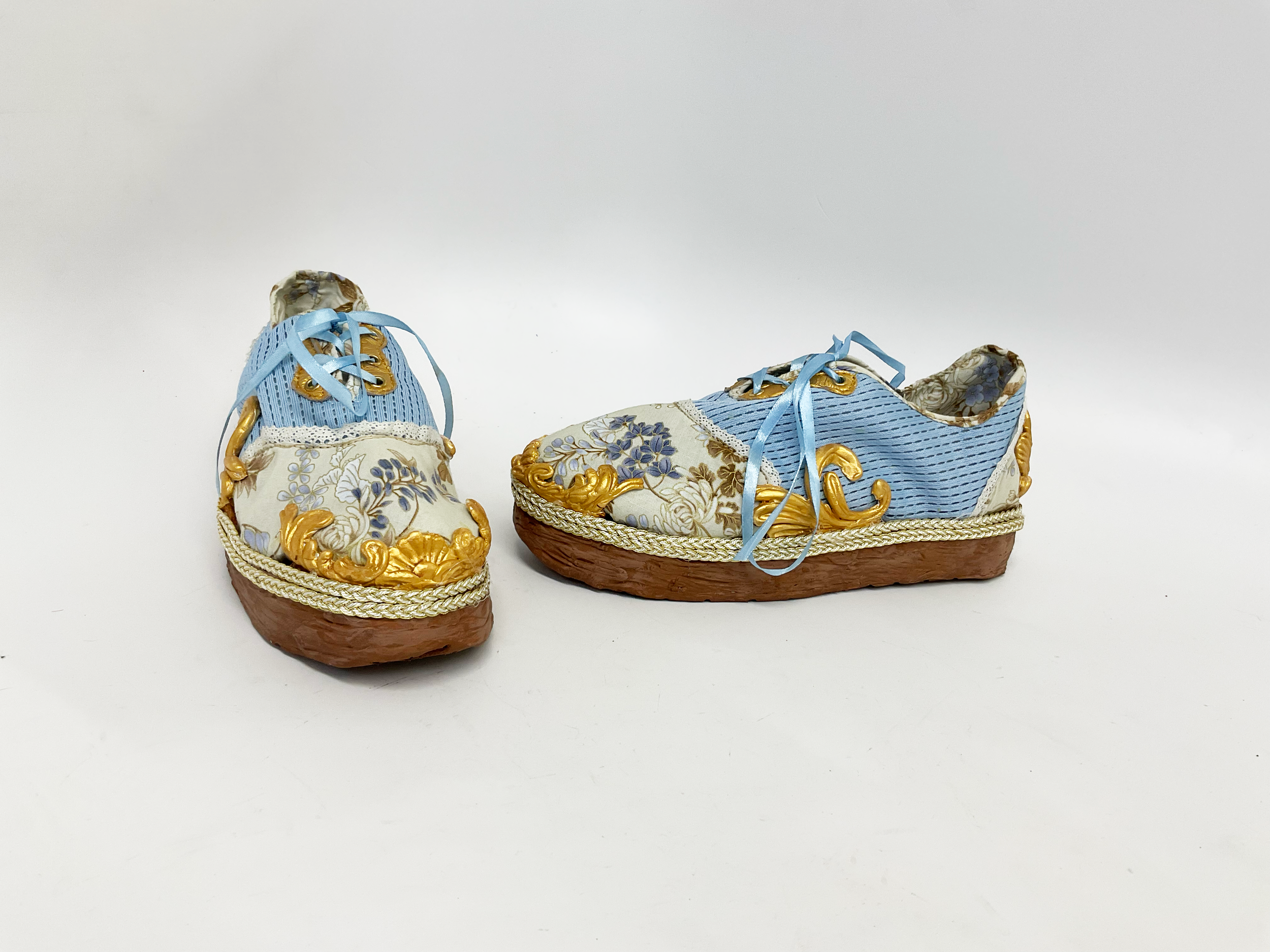 The guild lines for this design project were simply to design a sneaker using breathable flyknit material and a foam sole. With these broad requirements, I sketched several ideas before landing on a design inspired by the ostentatious Rococo fashion of the 1700s. The fabric was dyed by hand, to which the lining and patterned panels were sewn. All foam details were hand sculpted and painted to emulate metal and wood. Finally, the whole was constructed on a last to take the form of a shoe.